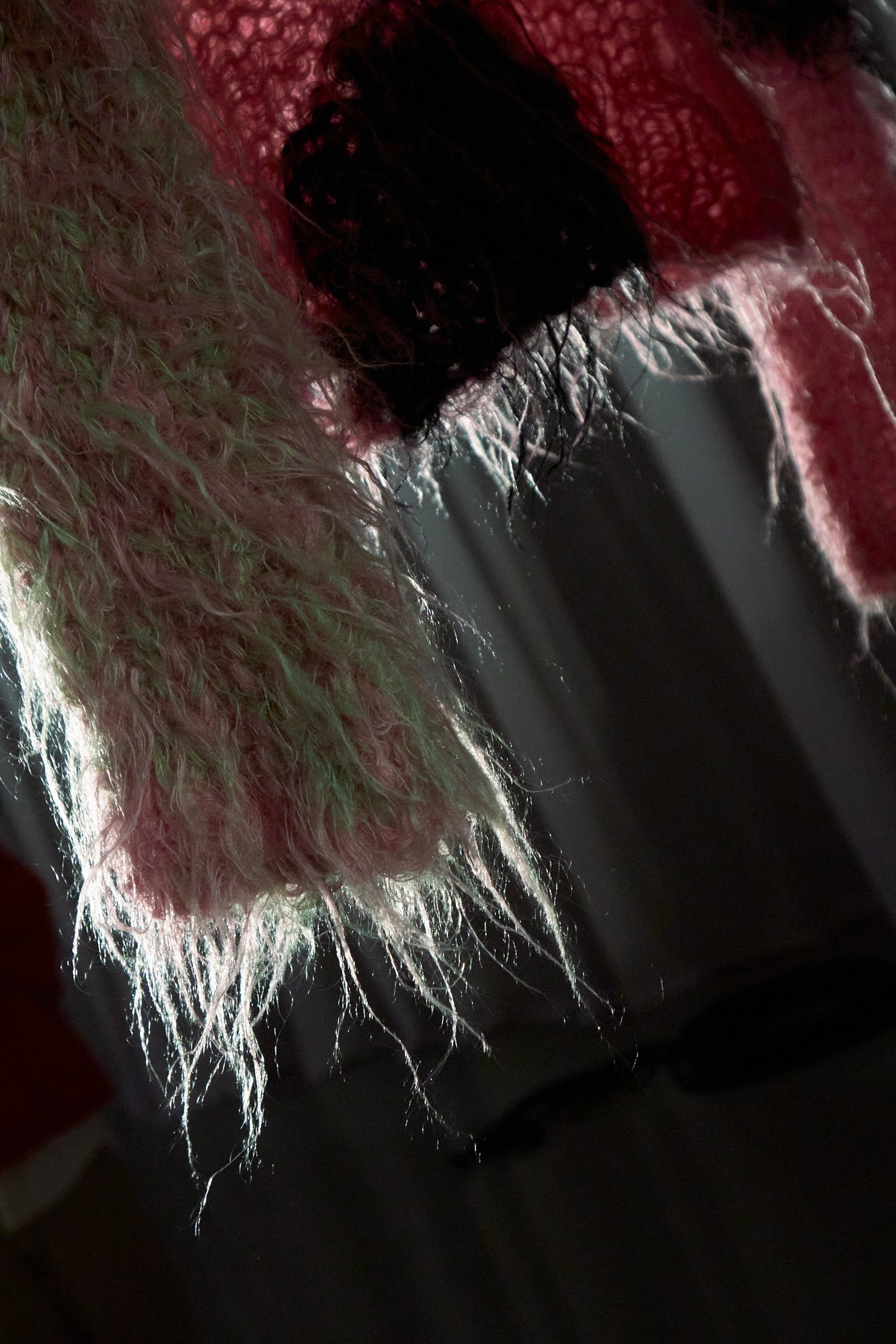烟草を呑みながら私は彼に、自分の仕事を全うするべき質問を投げ掛けた。ニットに固執する理由を訊いた。手仕事に根差したニットであれば、如何様にも立体的な造作にも辿り着くではないか。すると彼はこう返してきた。「僕にとって創作の題材としてのニットは、原糸の段階から始まり、染色、編み、整理などの様々な工程に於いて、限りなく自由なメディア。インターシャとか後加工による手刺繍とか、意匠を凝らすことで点描画のような微妙な陰影が表現出来る。3D的な造形ではなく、二次元的なカンバスにこだわるのはそうした理由です」と具志堅は云う。過去のコレクションにゴッホの自画像をモチーフにしたニットがあったが、原作の鬱屈とした味を、原糸の染色と編み地による微妙な陰影効果で表現していて、平凡なプリントでは再現し切れない原画の深みを再現していた。