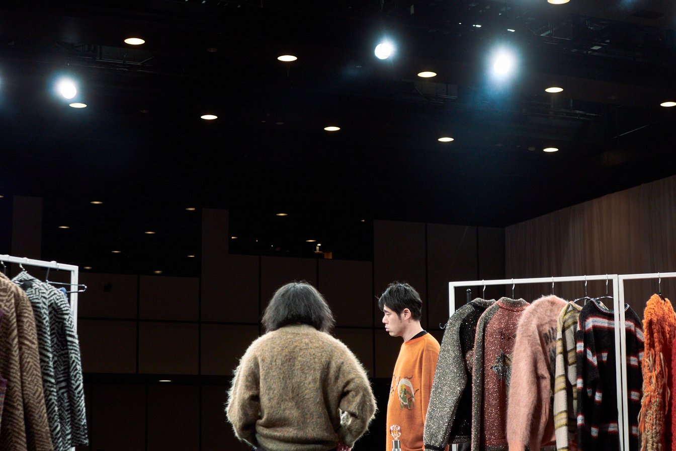 コントが進むにつれ、百戦錬磨の掛け合いで舞台を支配する主役であるところの彼等(又吉と好井)と、飽く迄もプロップとしての服(ニット)と云う関係が、たちまちにして崩壊した。舞台設定は仮構の古着屋かセレクトショップか。試着を繰り返す又吉と、その様子に合いの手を差し込み絡みつく好井。返しては寄せる大阪訛りの言葉の波。白熱する即興。はて、知らず知らずのうちに、ハンガーラックに吊るされたニットたちは静かに何かを喋り出すではないか。服は生き物か。いくら具志堅がレオナルド・ダ・ビンチとかゴッホだとかの名画を、自らのニットの題材に取り上げようとも、手ずから制作する彼の作品は、額縁に入れて壁に吊るす鑑賞物なぞではない。人が袖を通すことで、設計者や工場の職人たちの手の温度(敢えて温もりと云う常套句を使いたくない)を体感出来るところの、作る側と着る側の双方の心の贅沢をシェア出来る商品である。オブジェクトでも、況してや作り手の顔が見えない消耗品なぞではない。