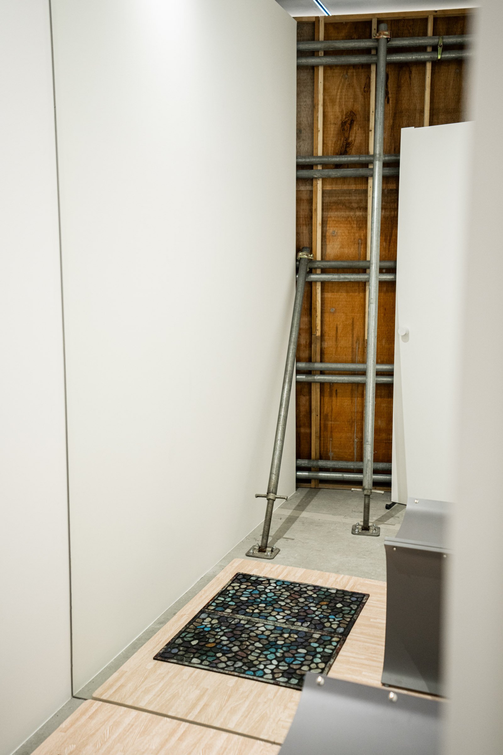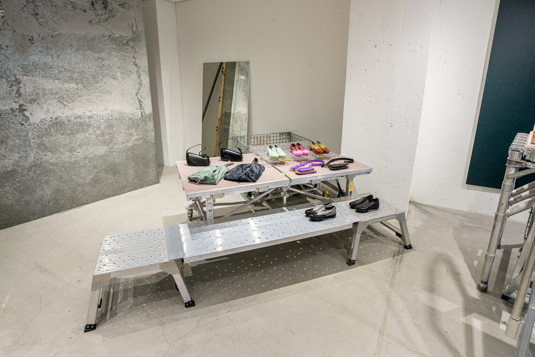 オープン時には、第1段階として、制作途中の状態を想起させる“仮設”や“保留中”をテーマにした空間を構成。外に面したガラス張りの壁面には、第2段階の店内イメージを再現したレンダリングプラン(完成予想図)を掲示しているほか、店内には、使用済みの足場や様々な建築資材を組み合わせて什器や装飾として配置することで、“下書き設定”の様子をユニークに表現している。今後は数ヶ月後に第2段階である「完成予想図」のような内装へ変更した後、1〜2年ほどの周期で新しいアーティストを招き、その都度アーティストの方向性に応じた新たなテーマに基づく内装に刷新する予定だという。
