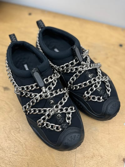 同コラボでは、オークリーの代表的なシューズの一つ「CHOP SAW MULES」をベースモデルに採用。ミュールタイプである「CHOP SAW MULES」は、独自のウエーブ状のウレタンソールや足にフィットする履き口を特徴としており、同コラボではスエード素材を使用し、カラーはオールブラックでまとめ、高級感のあるデザインに仕上げた。サイズは1cm刻みで25〜29cmまでを用意する。価格は税込3万3000円。