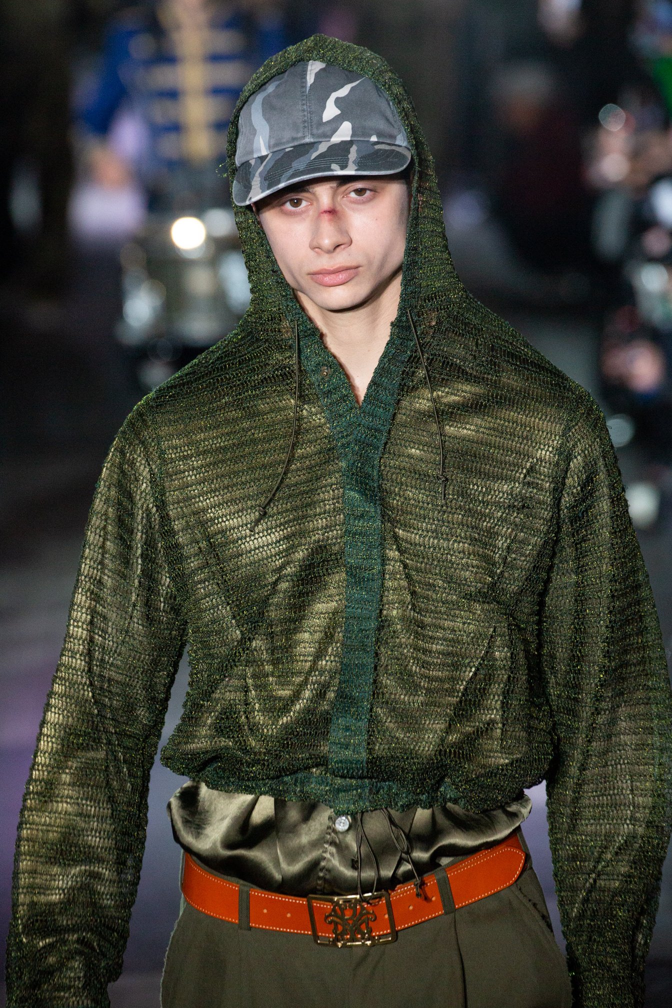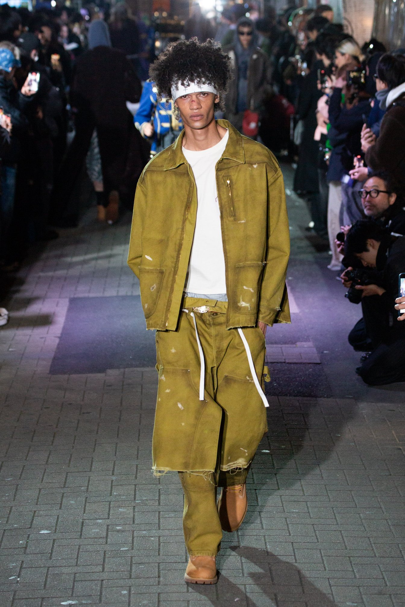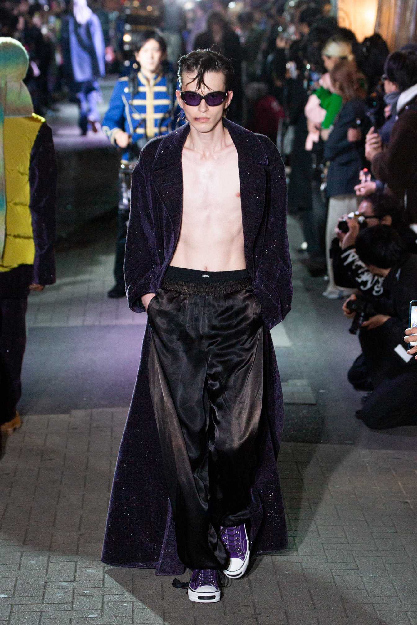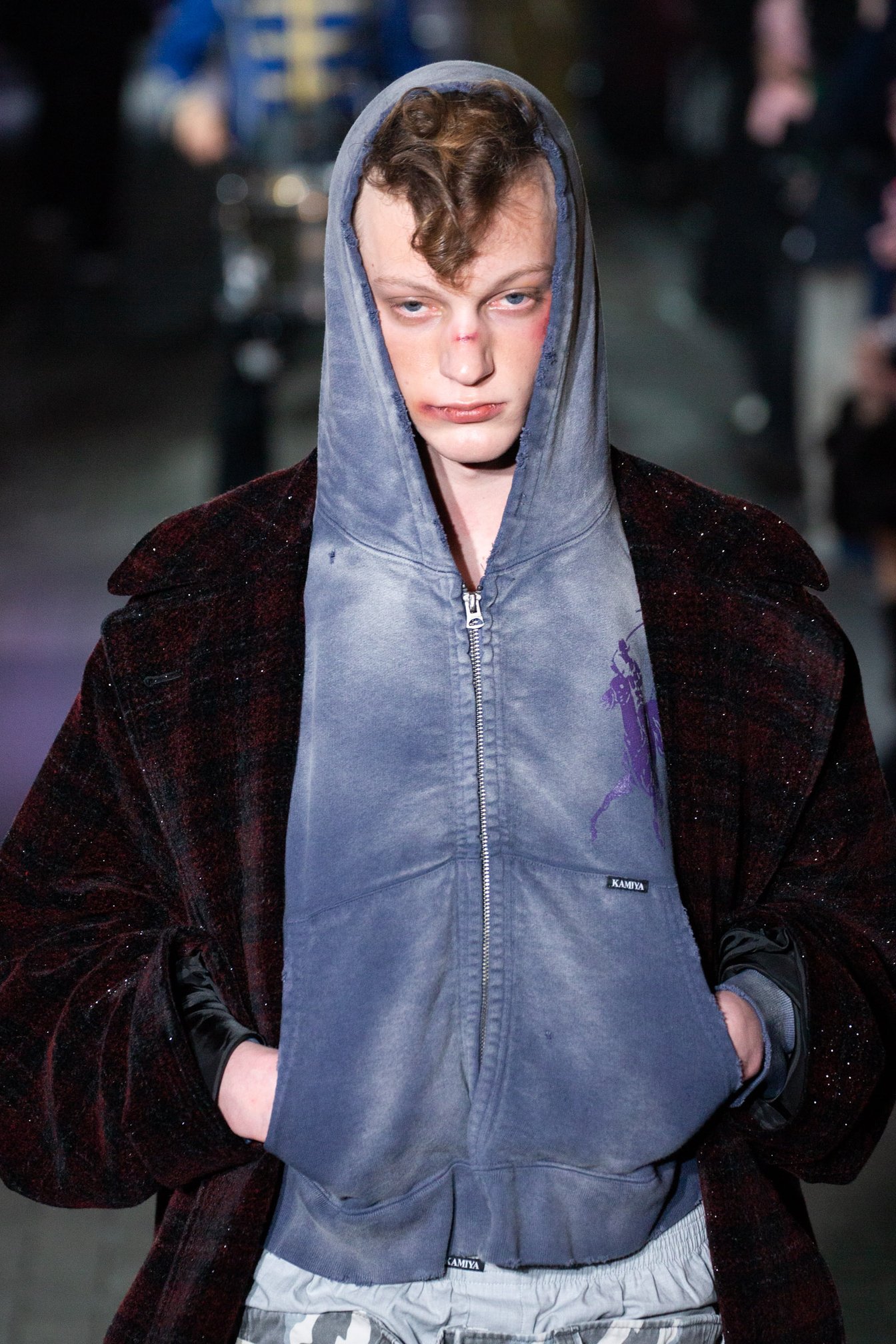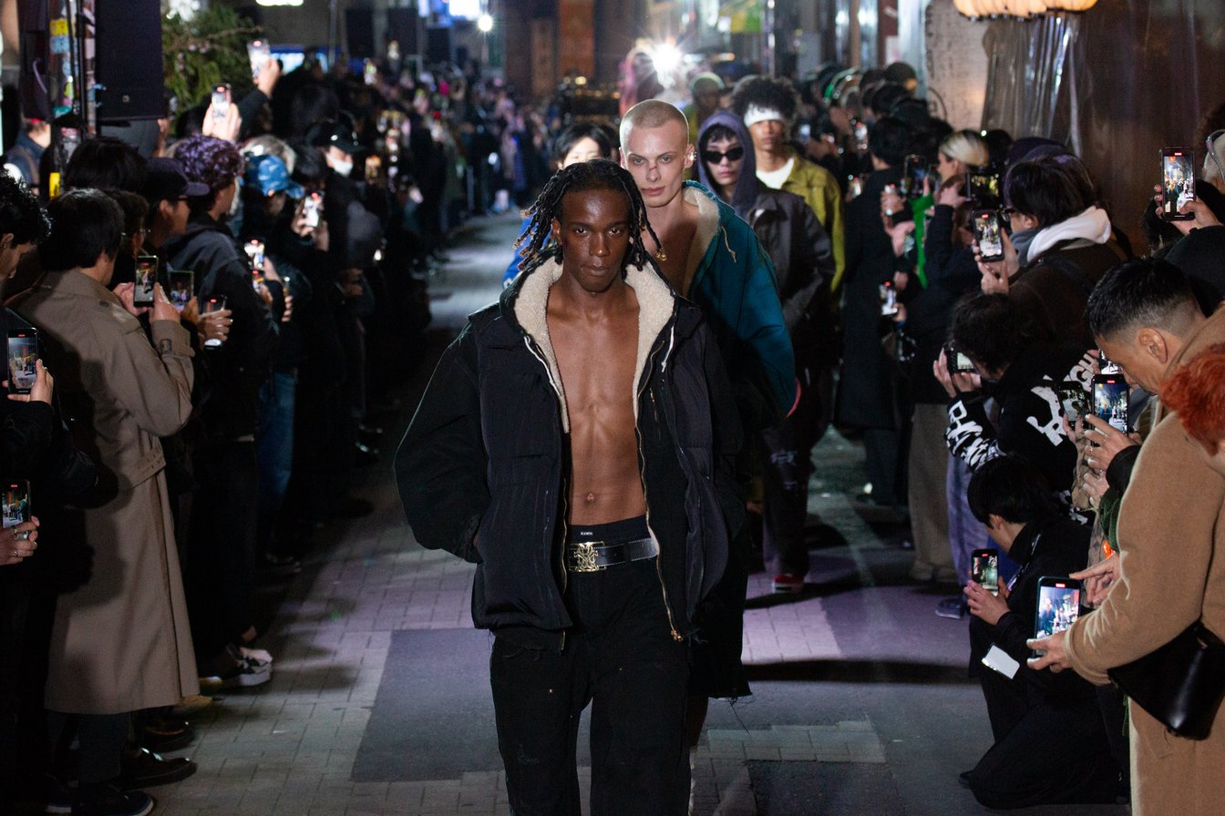 2024年秋冬コレクションで2度目のランウェイショーを行ったKAMIYA。会場は渋谷百軒店。関東大震災直後に「百貨店」をコンセプトに作られた商店街。いまとなっては珍しい喫茶店は1926年創業の「名曲喫茶ライオン」。レトロな雰囲気を醸し出す店が立ち並び、奥にはネオンが輝く現代的なナイトクラブ、ラブホテルが隣接する。日本の大正、昭和、平成の古き良き時代が令和に輝く唯一無二な街。テーマは「TIME IS BLIND(時は盲目)」ヴィンテージやブランドのアーカイブをこよなく愛するデザイナー神谷氏ならではの場所だ。2024年秋冬コレクションで1番印象に残ったショーを選ぶならば、筆者はKAMIYAをあげる。全てのショーの中で1番「男性性」を強く感じたからだ。