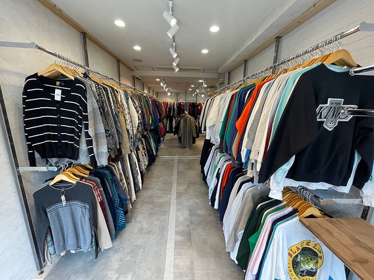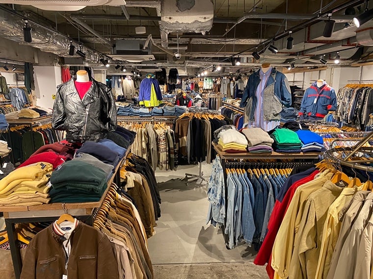 明治通り店は地下1階の店舗で300平方メートル強。21年5月に関東初進出としてオープンした原宿店が近隣にあるが、「原宿店はビンテージやオーソドックスな古着を扱う一方、明治通り店はトレンド重視で、今欲しい古着を中心とする。両店で違いを出すとともに、互いを回遊したくなるような店作りに