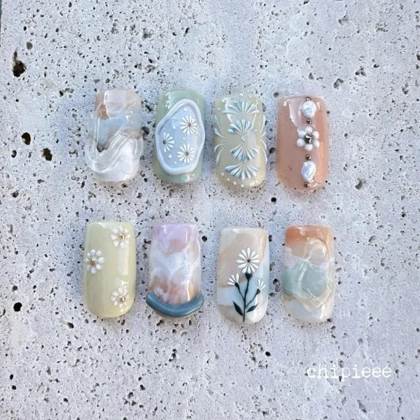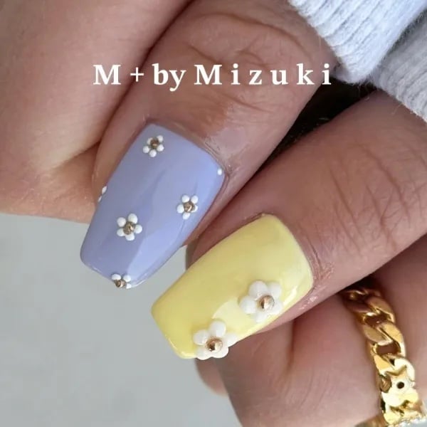 ①カラーで遊ぶ「デイジーネイル」はミニデイジーを散りばめて