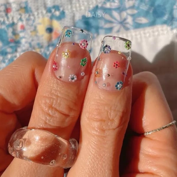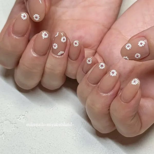 まず最初にご紹介するのは、小さな「デイジー」をいくつも散りばめたネイルデザインです。