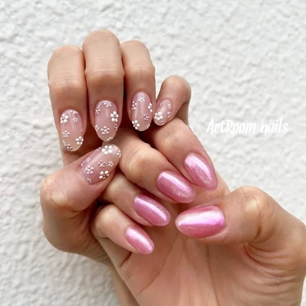 薄いピンクベースに、ぷっくりとしたピンクや白の花びらがかわいいお花を散りばめれば、満開のお花ネイルが完成!