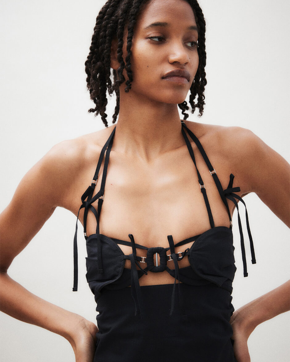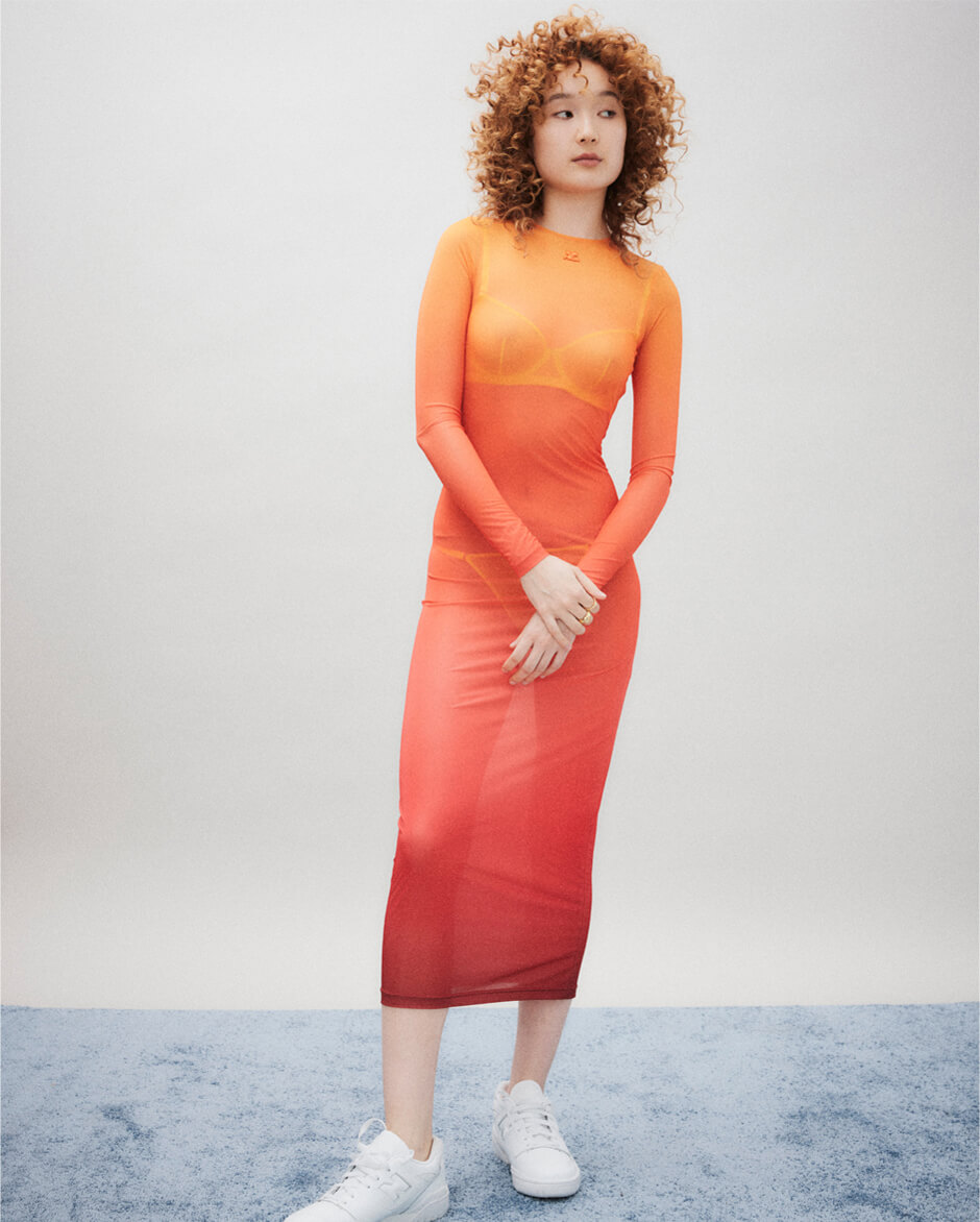 dress by COURRÈGES, bra and shorts by MAISON CLOSE, shoes by NEW BALANCE, rings stylist's own