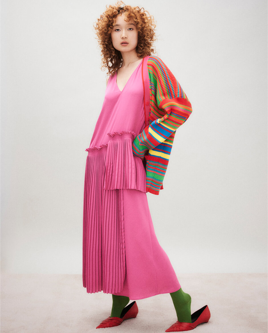 cardigan by VERSACE, dress by MAISON MARGIELA, socks by FALKE, shoes by COS