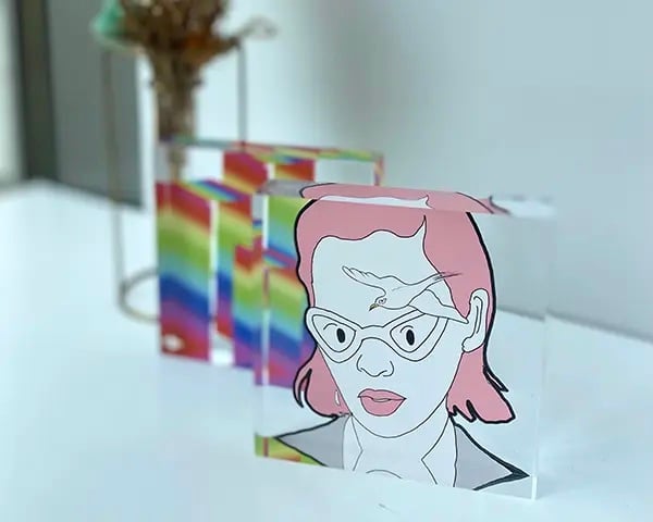 100mm×100mmのクリアブロックに作品を閉じ込めた「アクリルブロック」(税込3300円)は、4種類のイラストから選べます。