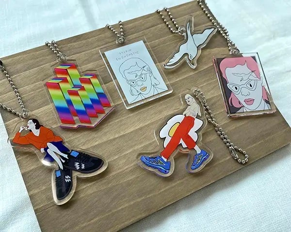 「アクリルキーホルダー」(税込495円)は、オーバーサイズのスニーカー履く女の子を描いたものなど、6種類がラインナップしていますよ。