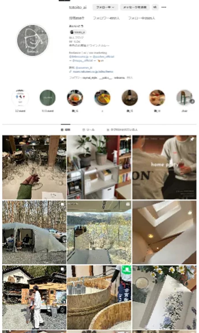 インテリアブランド「Little Rooms」での学生インターンや、ファッション通販サイト「nugu」のSNS担当などを経て、現在はフリーランスでECやSNSマーケティング担当を務める。個人のInstagramでは、おいしそうなお料理・ワインの写真、友達と開催したイベントの様子、反響が大きいおしゃれなおうちの様子など、aiさんの好きなものがたくさん詰まった投稿が並んでいる。