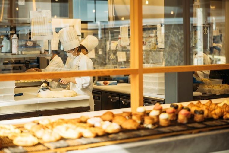 岡山天神店の1階。ファクトリーでパンが作られる様子が見える