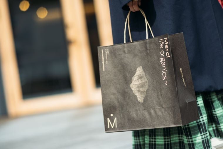 シグネチャーのクロワッサンのデザインをあしらったおしゃれな紙袋。再生可能な素材で制作している