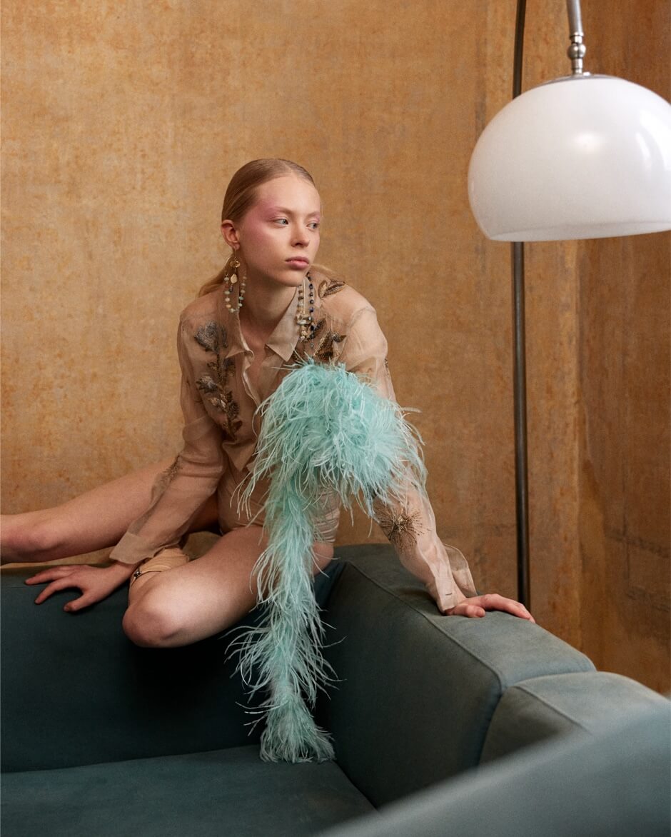 The styling color palette perfectly reflects the set tones, so that our moon child can merge gently, softly, delicate and fragile as she is - as the feathers she wears.