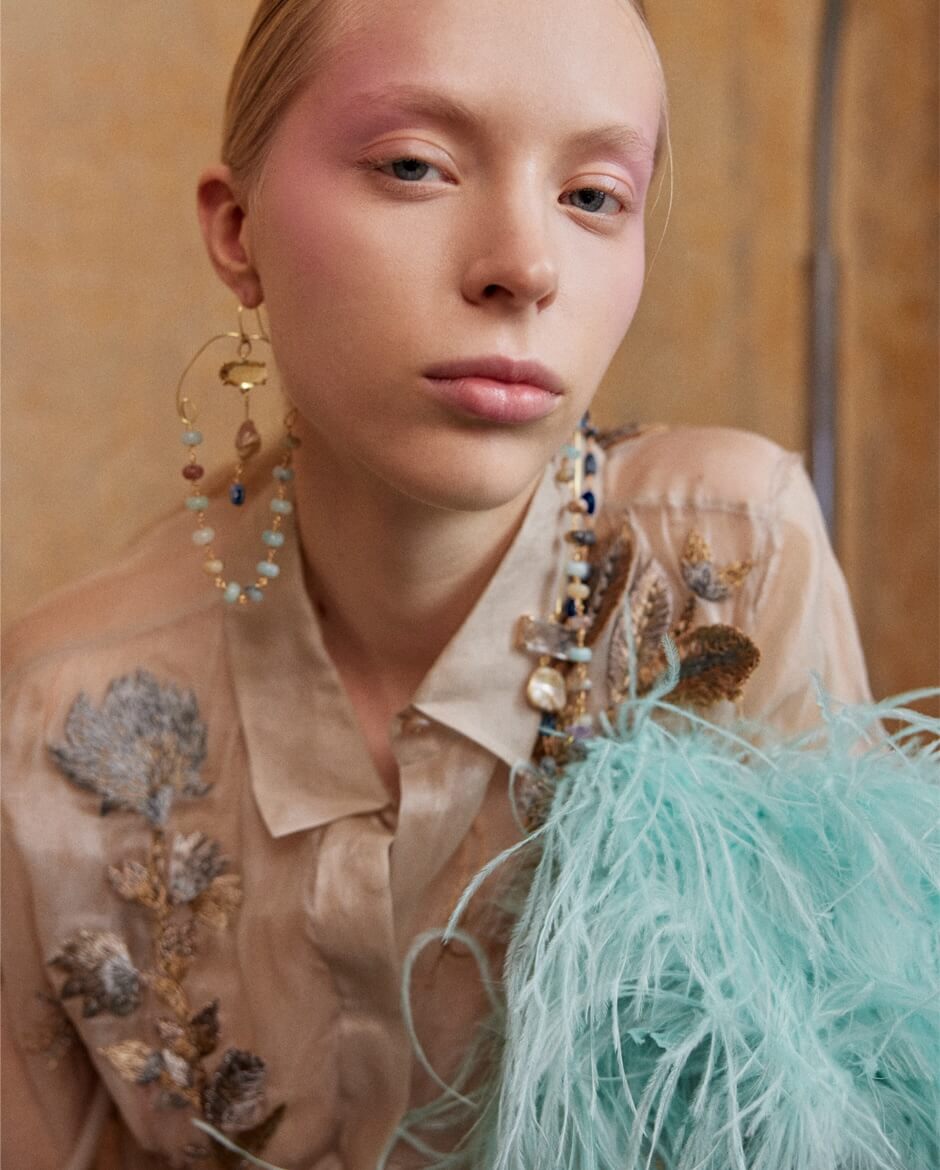 The styling color palette perfectly reflects the set tones, so that our moon child can merge gently, softly, delicate and fragile as she is - as the feathers she wears.