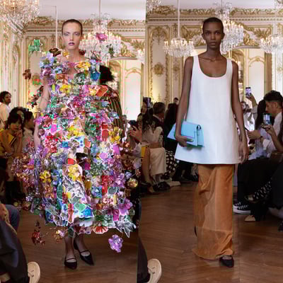 ポップアップは、パリにあるカール・ラガーフェルド(Karl Lagerfeld)私邸で発表された2024年春夏コレクションのアイテムを中心にラインナップ。同コレクションでは、ブランドのDNAである花柄やチェック柄などがふんだんに用いられ、ビッグボリュームからタイト、逆三角形まで様々なフォルムを提案。ポップアップ会場には、ショーのラストルックを飾った、古い植物標本集のイラストから着想を得たドレス(276万2100円)も登場。色とりどりの花のコラージュと、タイトなビスチェトップからエレガントに広がるボリューミーなシルエットが来場者の視線を集めそうだ。