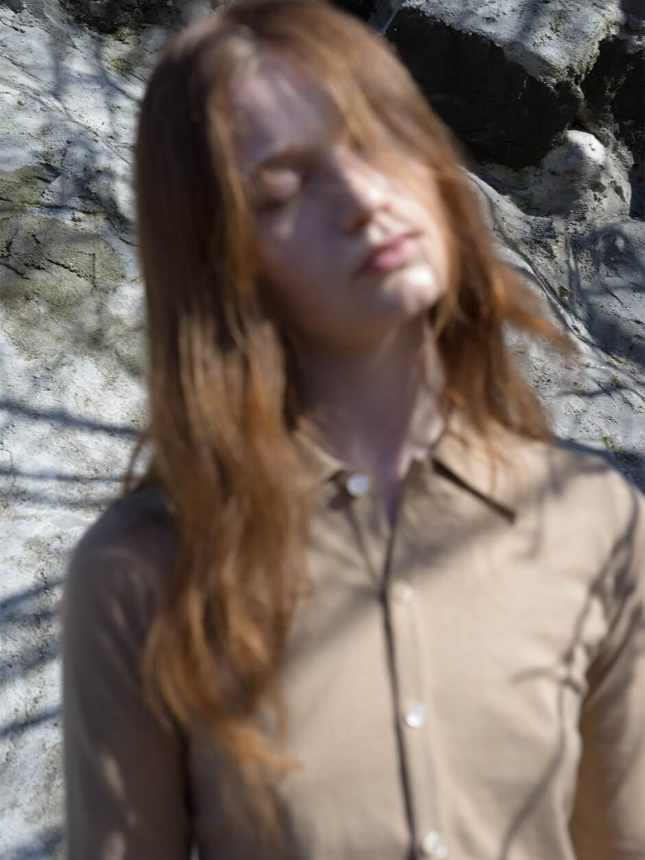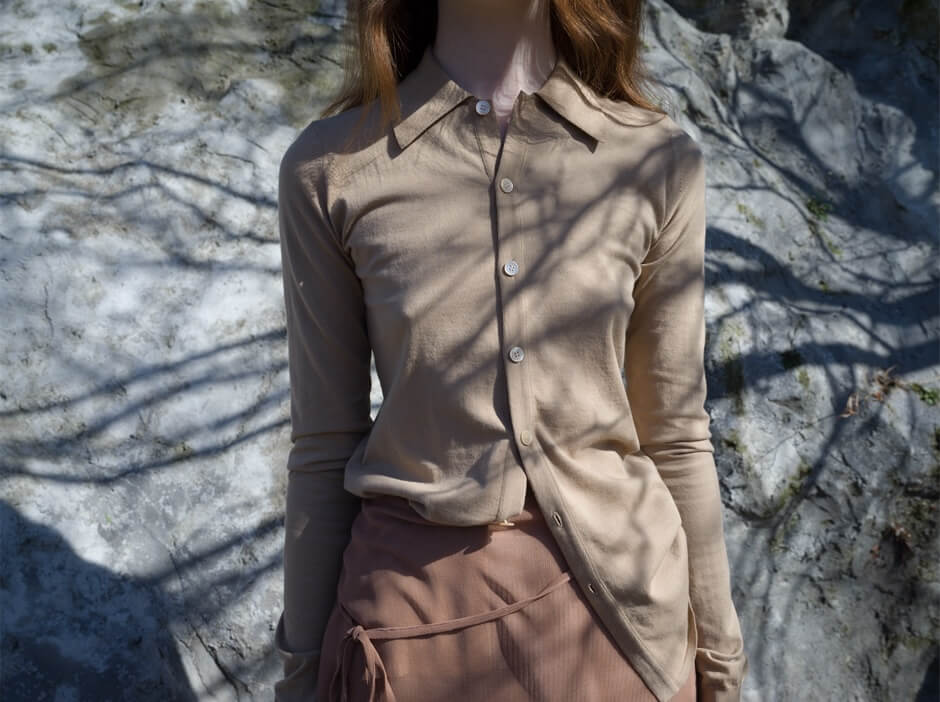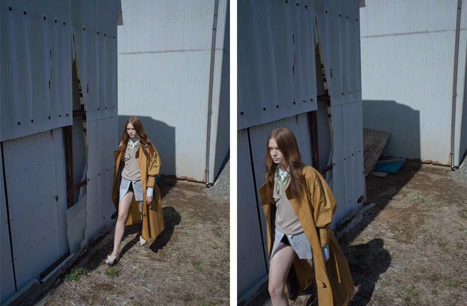 knit top by AURALEE, top, inner top, dress and trousers by ISSEY MIYAKE, shoes by MAME KUROGOUCHI