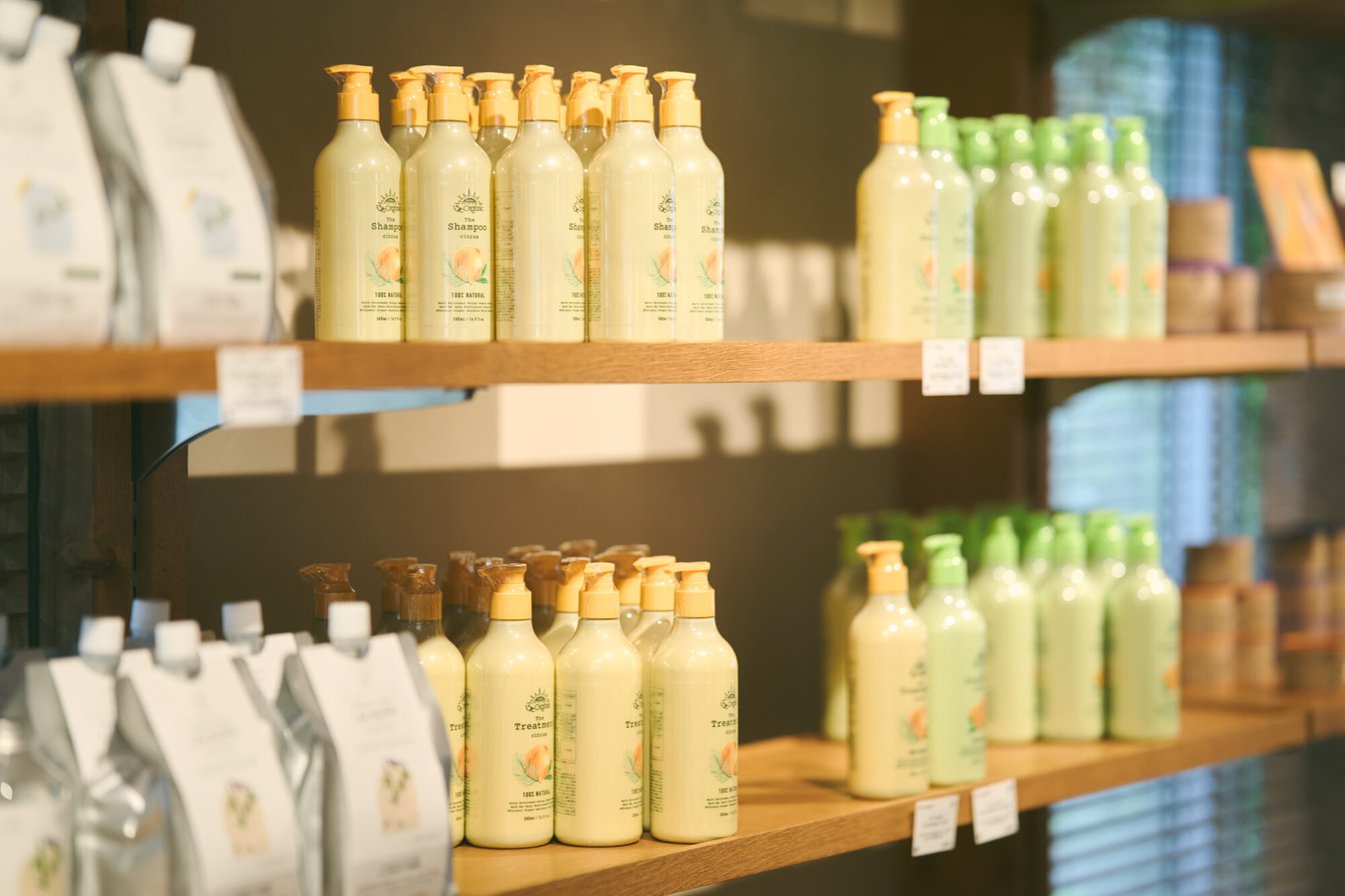 店内には、 自然栽培の野菜や果物、天然由来100%のコスメ・サプリなどのほか、「15/e organic」が開発したオリジナルシャンプーも並ぶ