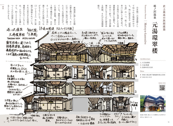 『ときを感じる お宿図鑑―スケッチで巡るレトロ建築ガイド』では、東北から、まるで竜宮城のような、温泉街を一望できる珍しい意匠の宿、山形県「赤倉温泉 湯澤屋」、江戸時代の素朴な建物で秘湯を楽しむ、山形県「滑川温泉 福島屋」、地形を活かした庭と建物すべてが見事な、福島県「会津東山温泉 向瀧」を紹介。
