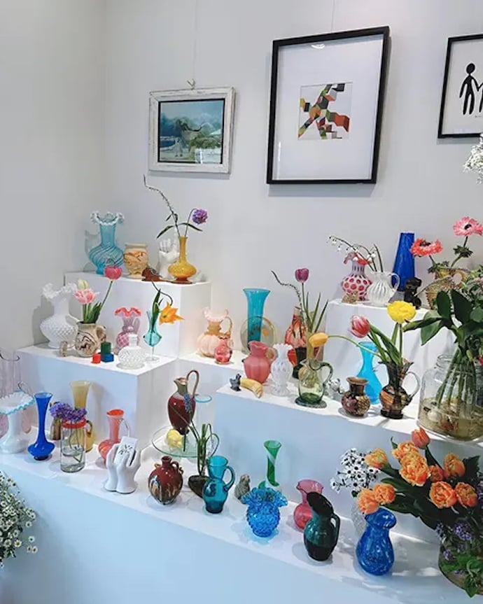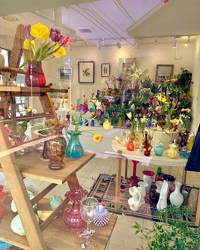 PART OF NATUREの店内は、まるで美術館。色とりどりのフラワーベースや、お花がずらりと並んでいます。