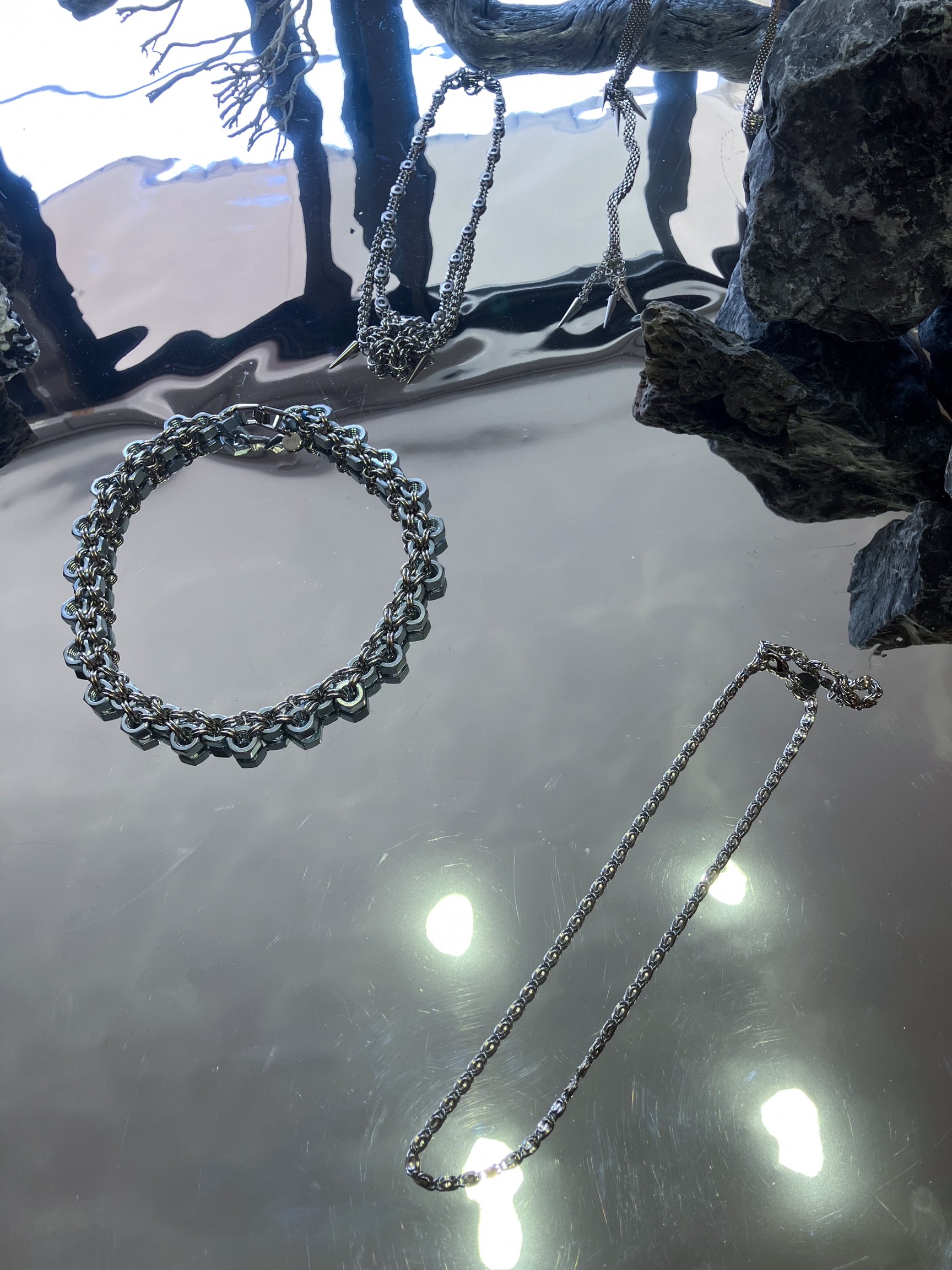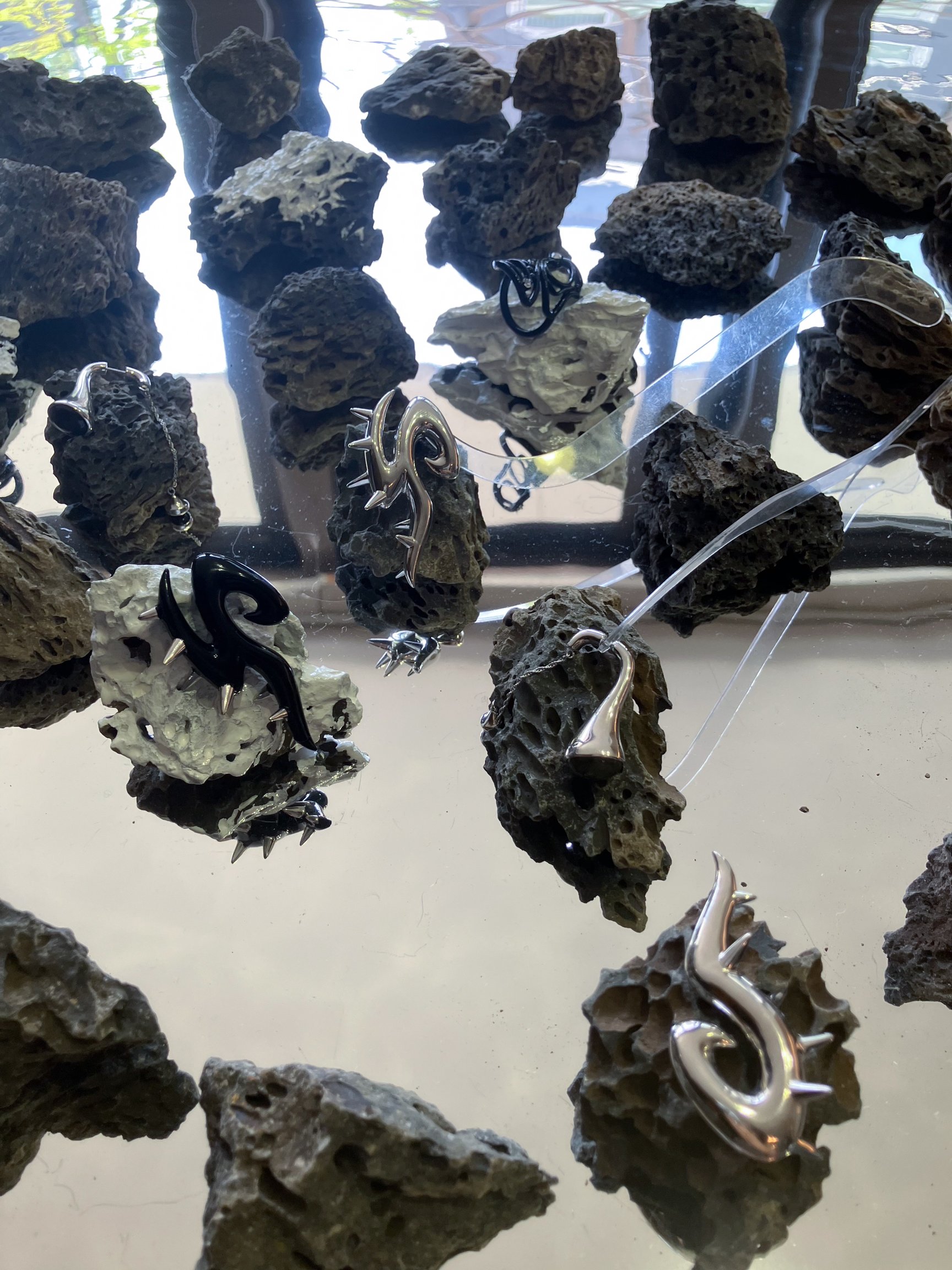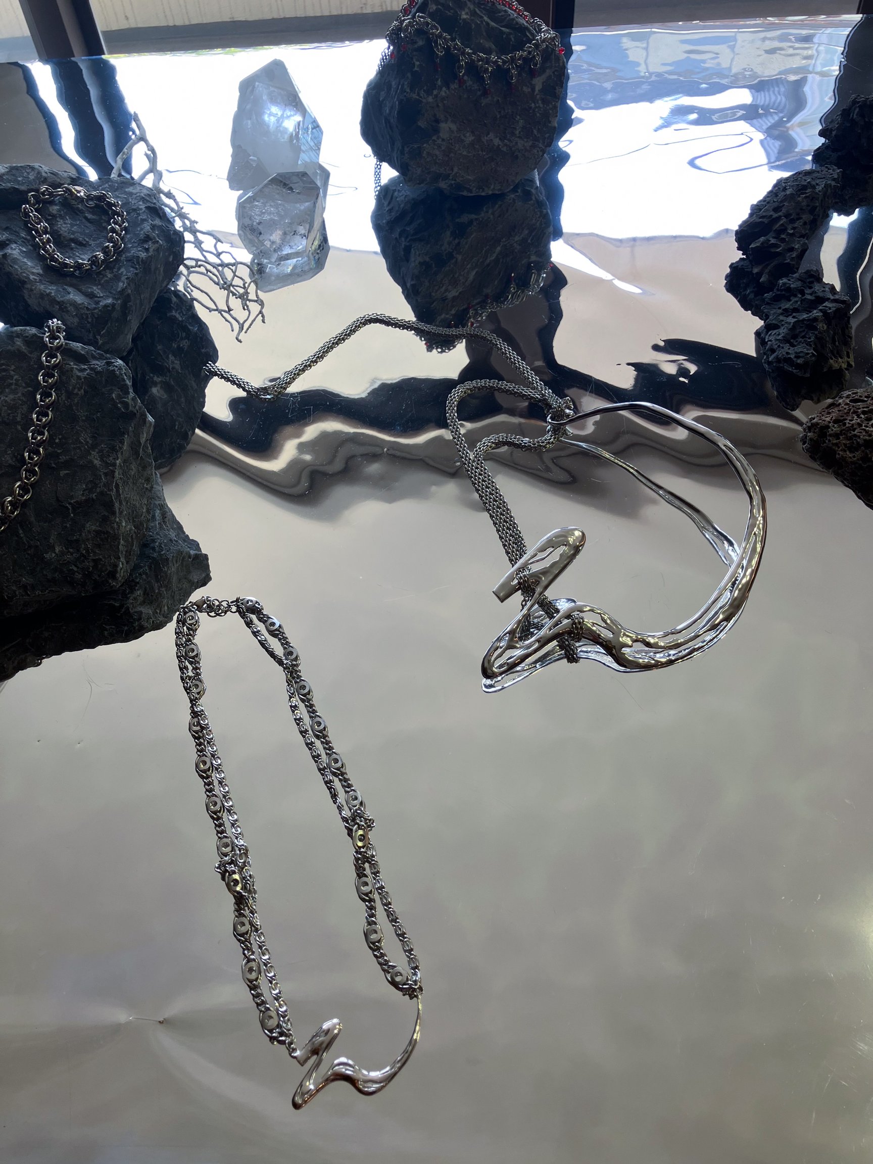 以前から音楽好きで、プライベートでも国内外の音楽フェスやライブなどを楽しんでいるというデザイナーの春井は、「これまでのようなファインジュエリーではなく、フェスやライブといった音楽シーンにも映え、踊る際にも気兼ねなく着用できるジュエリーを作りたいと思った」と新ライン始動の理由を説明。アイテムは、空想上の花や植物の棘、水で「R」の文字を描いたような流線形のモチーフなど、ユニセックスで有機的なデザインのリングやピアス、ブレスレット、ネックレスなどをラインナップしている。