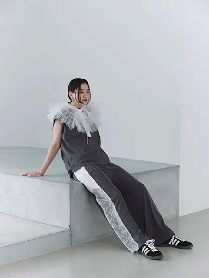 ボトムスには、「レースラインジャージ パンツ」(税込1万1000円)を合わせるのがぴったり。フェミニン×スポーティーが融合した、今年らしい1本です。