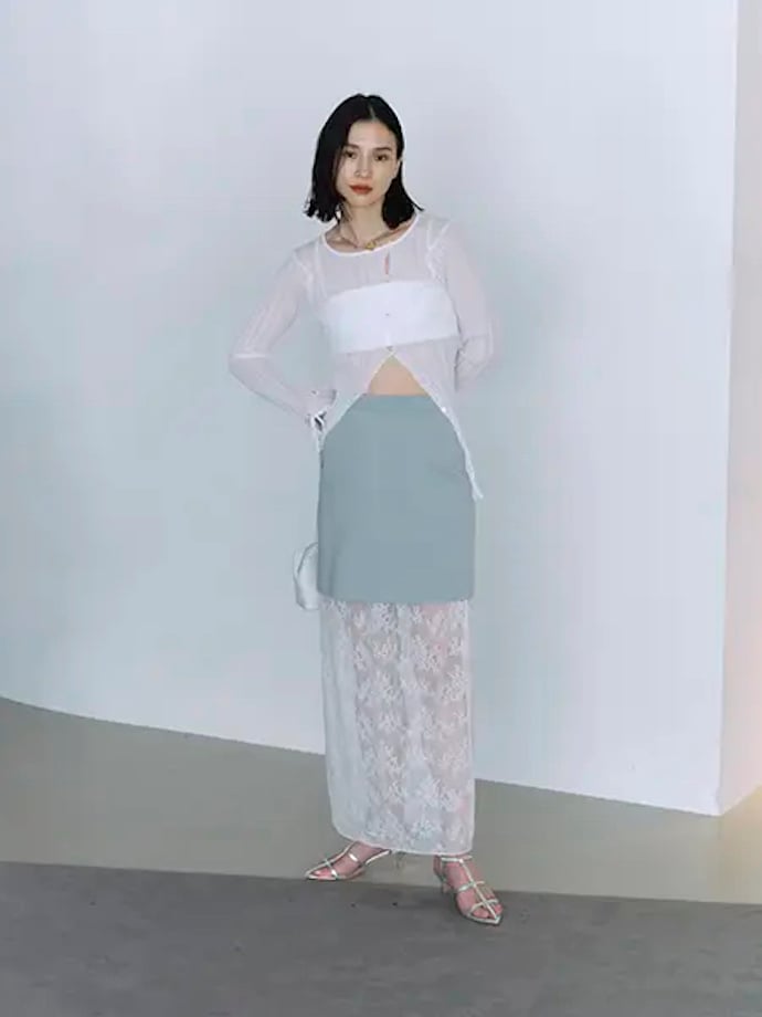 レースを外にしてニットスカートを裏地代わりに穿いても、ニットを表にして裾からレースを見せてもOK。さらにレース単体でパンツとレイヤードしても着られる、マルチに活躍する便利なアイテムなんです。