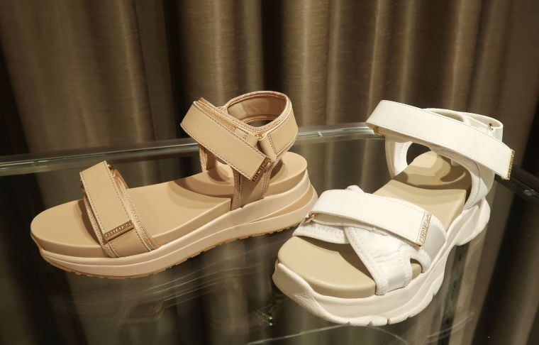 気温が上がった5月は、スポーツサンダルが順調に伸びている。アイボリー、ベージュなどの女性らしい配色、ゴールドカラーのロゴパーツやグログランテープの装飾で品の良さを感じさせる。履き心地も研究し、一段とクッション性を高めた。