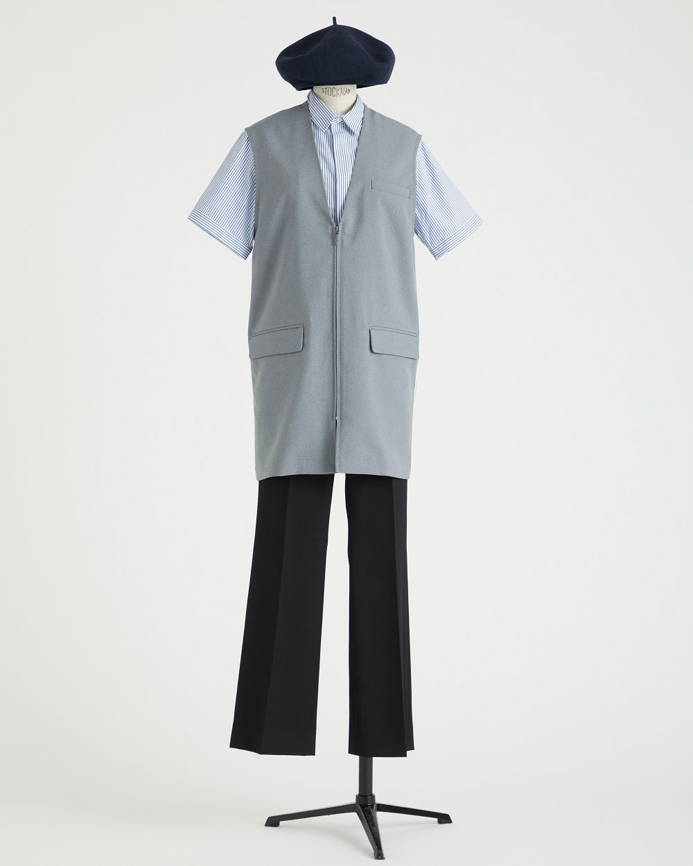 ショップスタッフのユニフォームは、様々な種類のグッズ販売を担うことから、専門知識と情報を持つエンジニアのような存在をイメージ。エンジニアコートから着想したワークコートは、適度なきっちり感がありながら大きなポケットを備え、ワークに適した機能性も加えた。ストライプ柄ですっきりとした印象のシャツはカフェスタッフと同様のもので、胸ポケットの入口をあえて斜めにカットすることで、藤子・F・不二雄の作品世界を彷彿とさせるSF感や不思議さを表現したという。