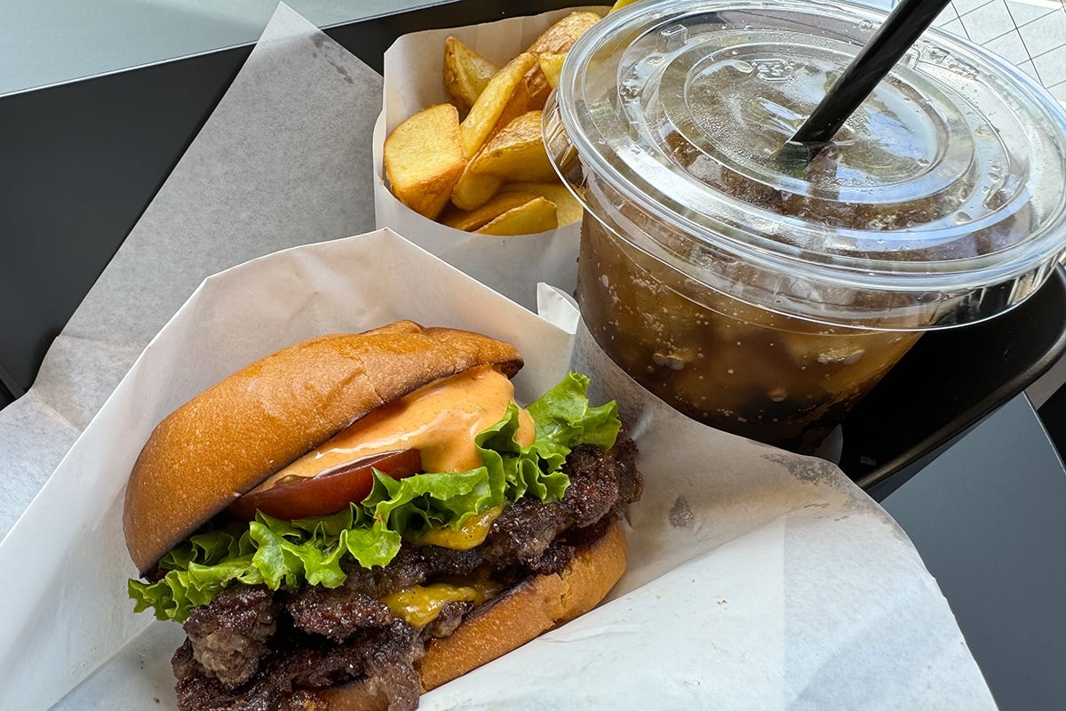ワクワクしながら待っていると、ハンバーガーセットが到着。バンズからはみ出た肉が最高だ!
