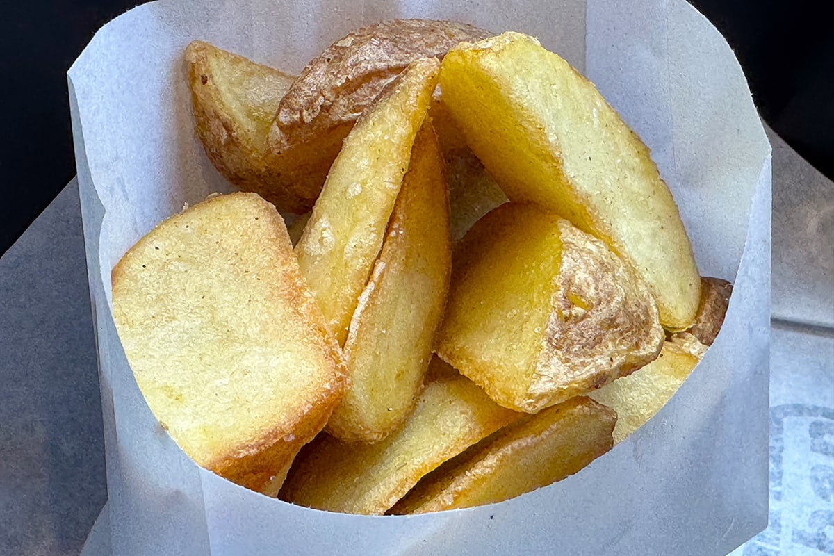 セットのフレンチフライは、細めのストレートなタイプと厚めのナチュラルなタイプの二種類から選ぶことができる。筆者は皮付きのナチュラルなフレンチフライをチョイス。ほどよい塩気と、ホクホク食感がウマい。細くカリカリのフレンチフライも好きだけれど、個人的には“芋”を感じられる厚めのフレンチフライが好みだ。