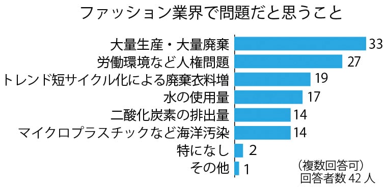 「ファッション業界で問題だと思うこと」は「大量生産・大量廃棄」が最も多く33件だった。次いで「労働環境などの人権問題」(27件)、「トレンドの短サイクル化による廃棄衣料の増加」(19件)だった。