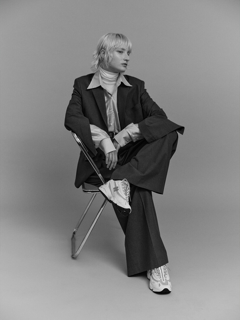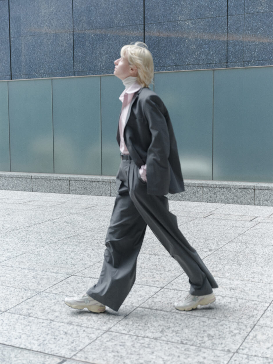 shoes ¥18,700 by NEW BALANCE NEW BALANCE JAPAN CUSTOMER SERVICE, jacket ¥93,500 and trousers ¥46,200 by HYKE BOWLES, shirt, top and socks stylist’s own