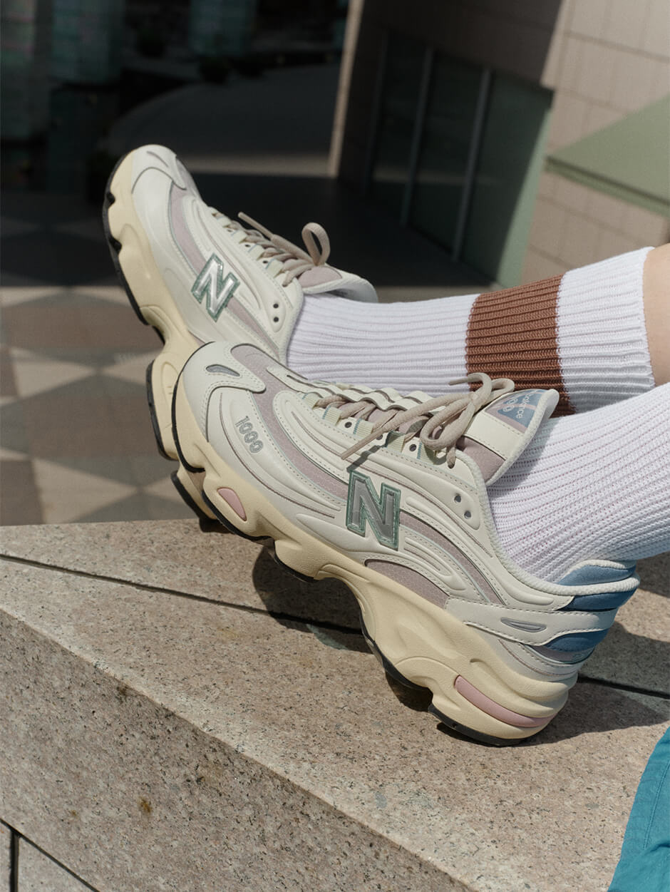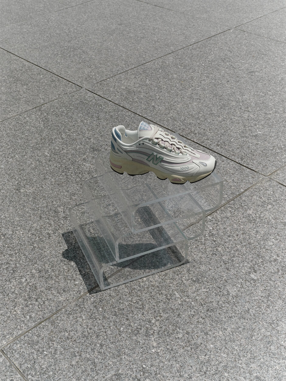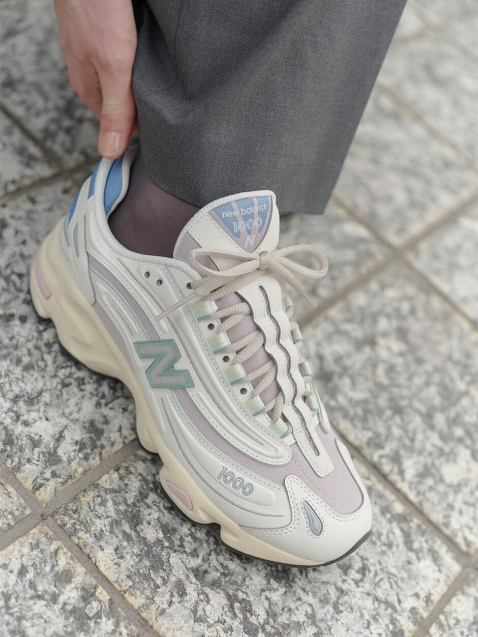 テクニカルなディテールの妙が光るアッパーは、グレーのリップストのテキスタイルとホワイトのシンセティックレザーを配し、サイドには、揺るぎないアイデンティティーを語る「N」と「1000」のロゴが刺繍で刻まれた。