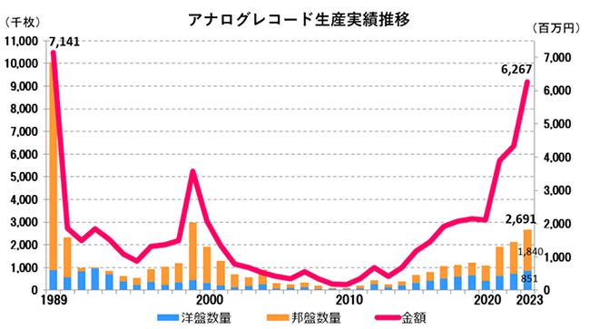 冒頭でも触れたとおり、日本のアナログレコード市場は数十年ぶりの伸びを見せている。日本レコード協会の発表によると、アナログレコードの2023年生産実績は数量で前年比126%の269万1000枚。金額では前年比145%の62億6700万円とななった。
