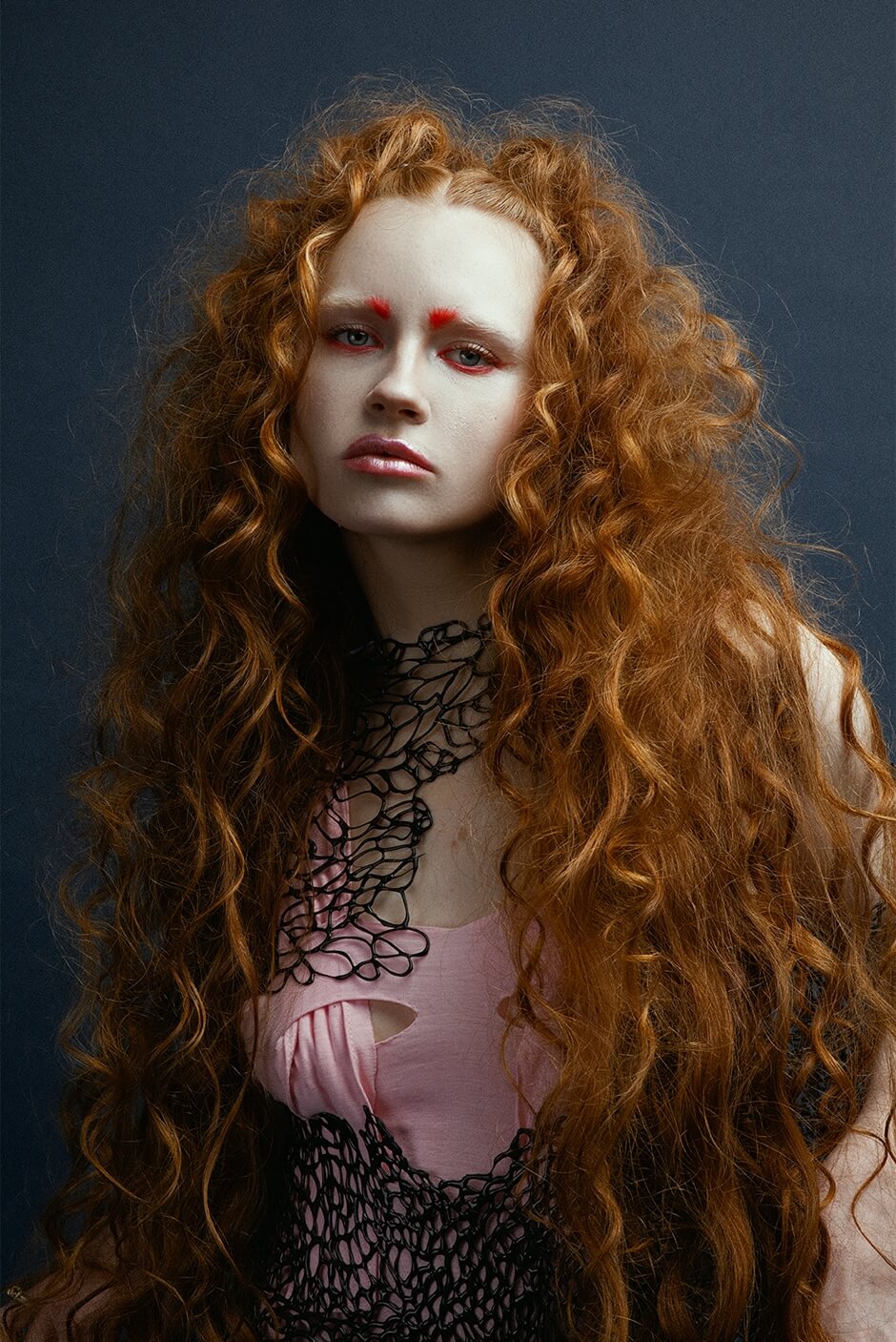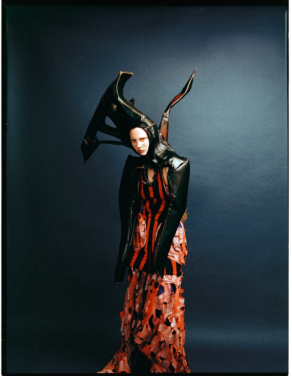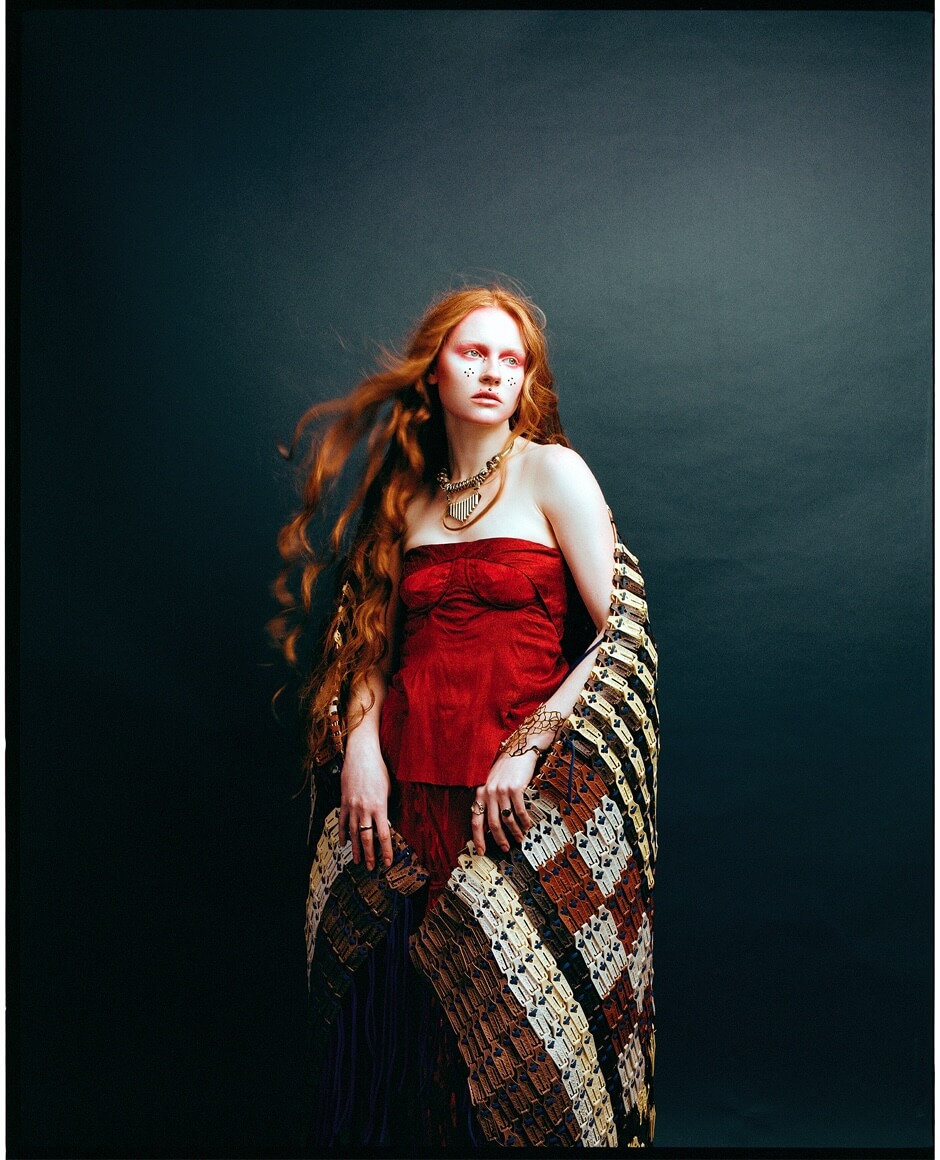 dress by MARIA GOUNDRY, headdress by EILEEN SUN, necklace by 886 LAB