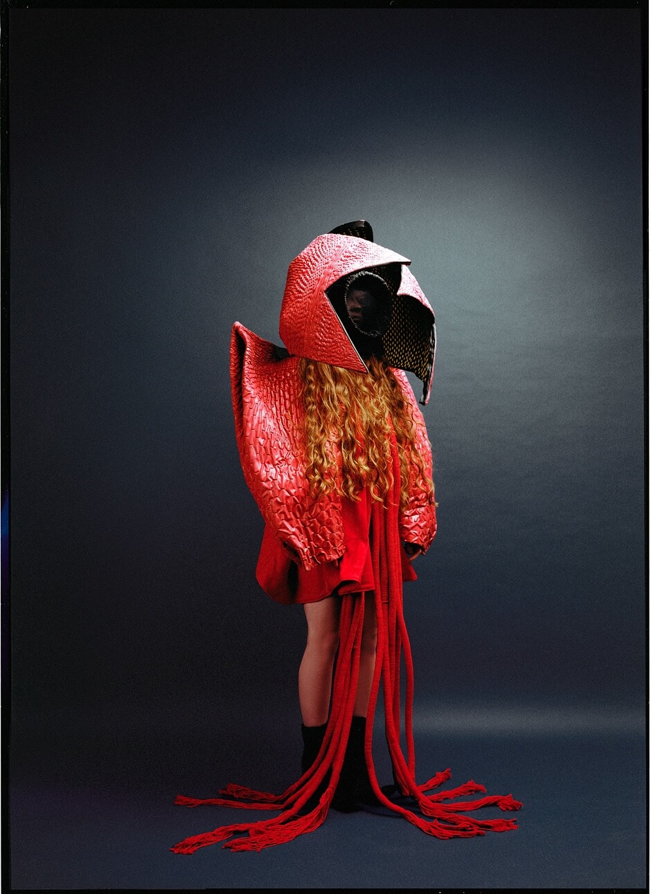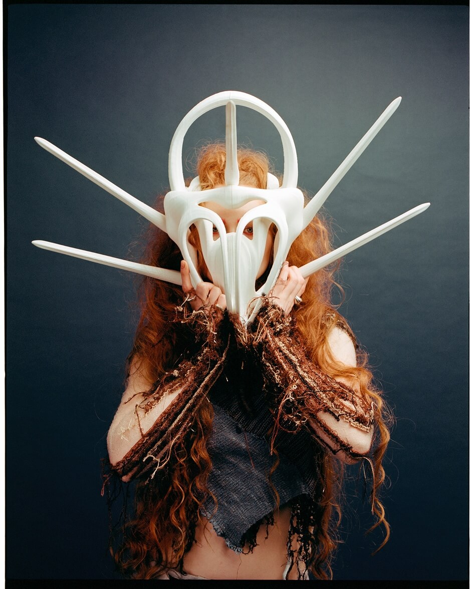 top and skirt by QINNAN LI, mask by THOMAS VEERAG STUDIO, left rings by LONELY OBJECTS, right ring by ALVALLIO DESIGN