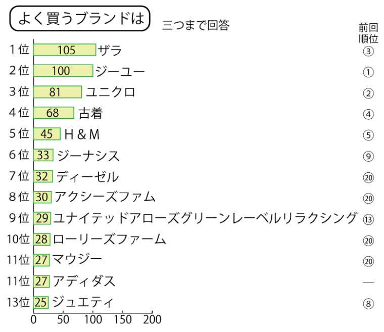 「よく買うブランド」は、19~21年に3年連続で1位だったザラが、前年の3位から首位に復活した。昨年1位だった「ジーユー」が2位、一昨年1位で昨年2位だった「ユニクロ」は3位で、一つずつ順位を下げた。4位古着、5位「H&M」は昨年と同じ順位で、今年も内外の大手SPAと古着が定位置のトップ5の座を占めた。