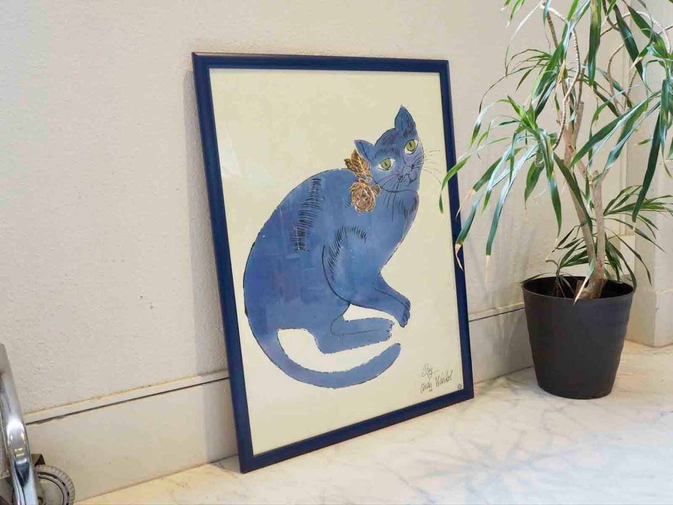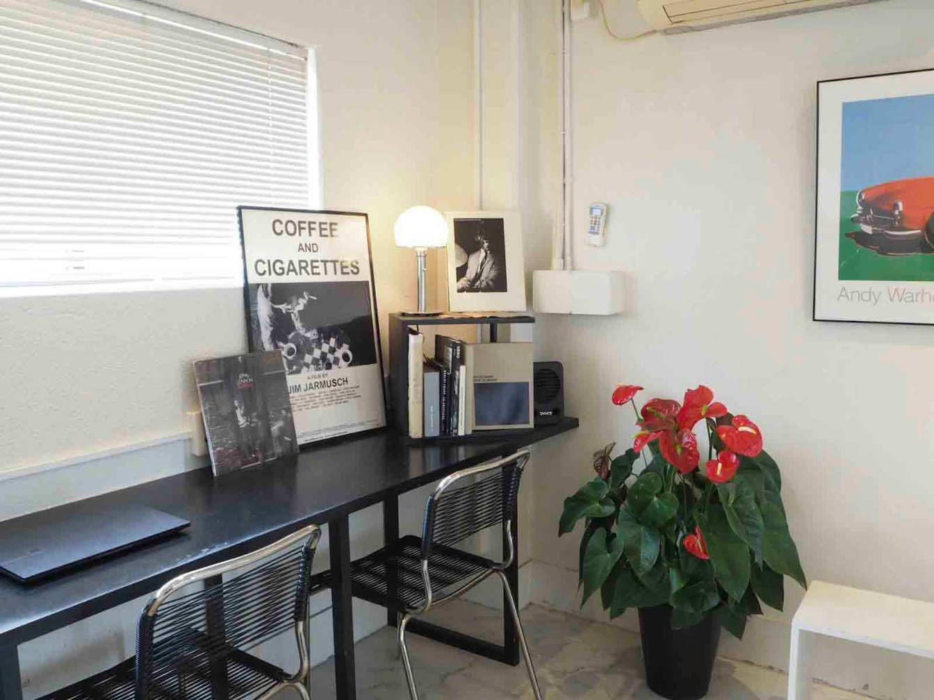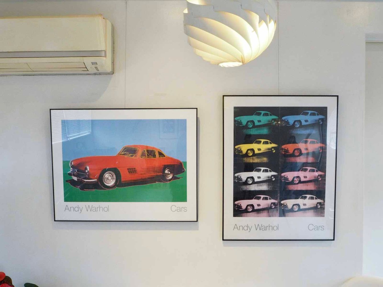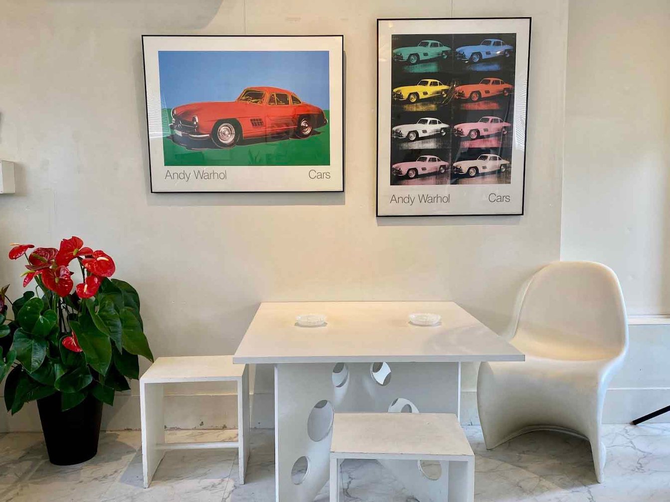 部屋の突き当たりには、白いテーブルとイス、そしてアンディ・ウォーホルのカラフルなポスターがコントラストになって目を引く場所。