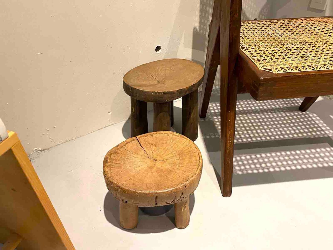 横に置かれている小さいイスはジャンヌレと同じくル・コルビジェのアトリエに入所していたシャルロット・ペリアンのペルジュ・スツール。