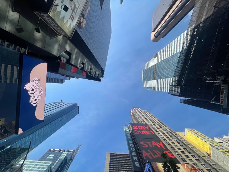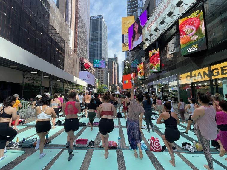 市の中心にあるブライアントパークでも、毎年夏に毎週無料のヨガクラスが行われている。そちらも毎回多くの人々が参加するのだが、このタイムズスクエアのヨガイベントは他にない特別感がある。普段は、車が行きかうタイムズスクエアの車道でヨガなんてもちろんできない。年に1度だけ、それが叶うのだ。路上にヨガマットをしいて寝転んで空を見上げるのは実に爽快だ。そんな「非日常の」体験が無料で、しかも多くの人にとってアクセスしやすい場所でできることが人気の理由だろう。周辺にそびえる高層ビルも視界に入るし、場所によっては伊藤園の広告に出ている大谷翔平選手の写真も目に入る。