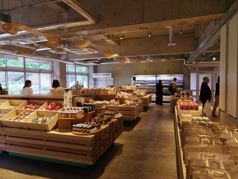 キトの1階には地元の食材や資源を生かし、地産の視点でメニューを揃えたレストラン&カフェ、醸造所、地元農家による新鮮な食材や奈良でセレクトしたものが楽しめるマルシェなどを設ける。すでに複数のオリジナルビールやプリンなどの食品の開発・販売体制が整っており、Tシャツやエプロン、グラスなどのグッズも今後加わる。キッズスペースは、地元の木材を体感できるスペースとして迷路や登れる本棚などがある。企業からの寄贈品という形で幅広い本が集まった。2階には奈良で活動する作家の作品を展示販売するギャラリーや体験ルーム、3階はレンタルオフィスやイベントスペース、4階はスタジオやフリースペースで構成する。