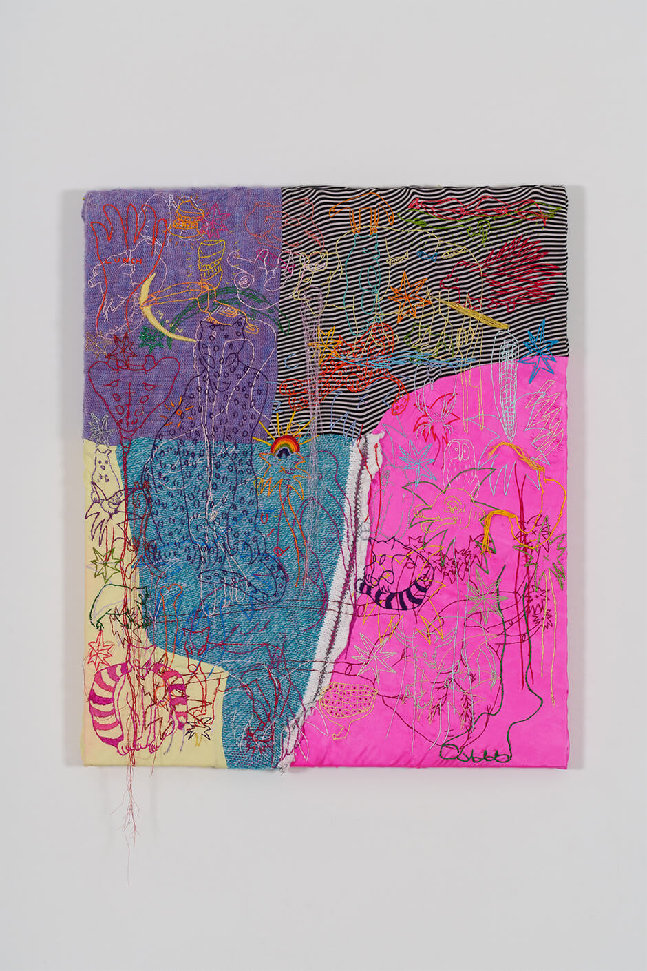 会場はペインティングとドローイングを中心に構成され、服を制作する前に色や素材の質感、仕上がりを確認するために使用される「AGNÈS B.」の布地(スワッチ)を使った作品も展示。また、1994年以来ブランドがアート作品と同じように大切にしているアーティストTシャツシリーズ「T-shirts d’artistes!」に、今回は川内が参加する。