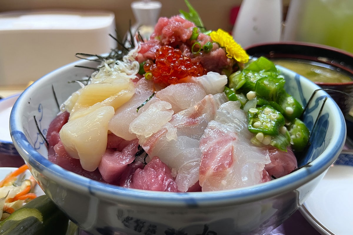 ネタはイクラ、鯛、ほたて、しらす、この下にマグロの赤身、中トロ、中落ち、ネギトロを敷き詰め、刻んだオクラもさっぱりと良い仕事をしてくれる。