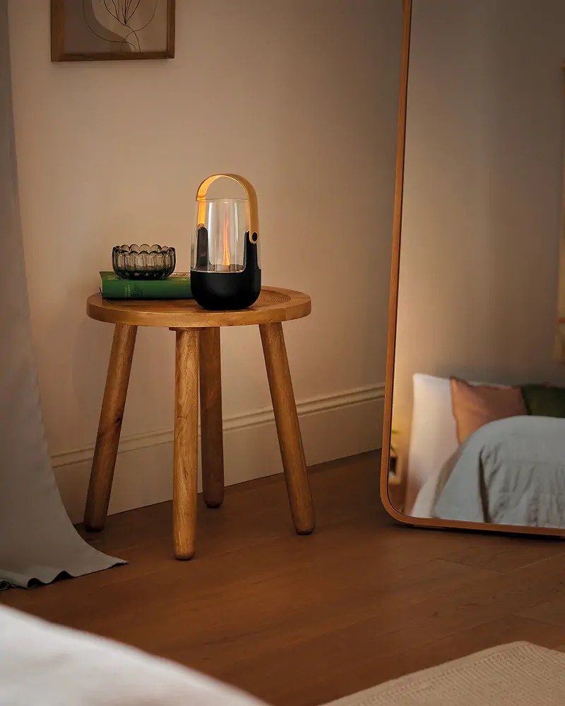 細長いラウンド型のフォルムとアンバーカラーのLEDがキャンドルのような炎を演出する「ルーシー(Lucy)」。手に収まるサイズでコードレスの充電式なので、リビングや寝室、エントランスやトイレなど置く場所を選ばず持ち運びにも便利。ホワイトとブラックの2色を販売しています。
