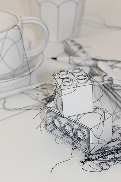 刺繍の平面作品や立体作品のインスタレーションなど、白い布と黒い糸を使ったアートを数多く生み出しています。