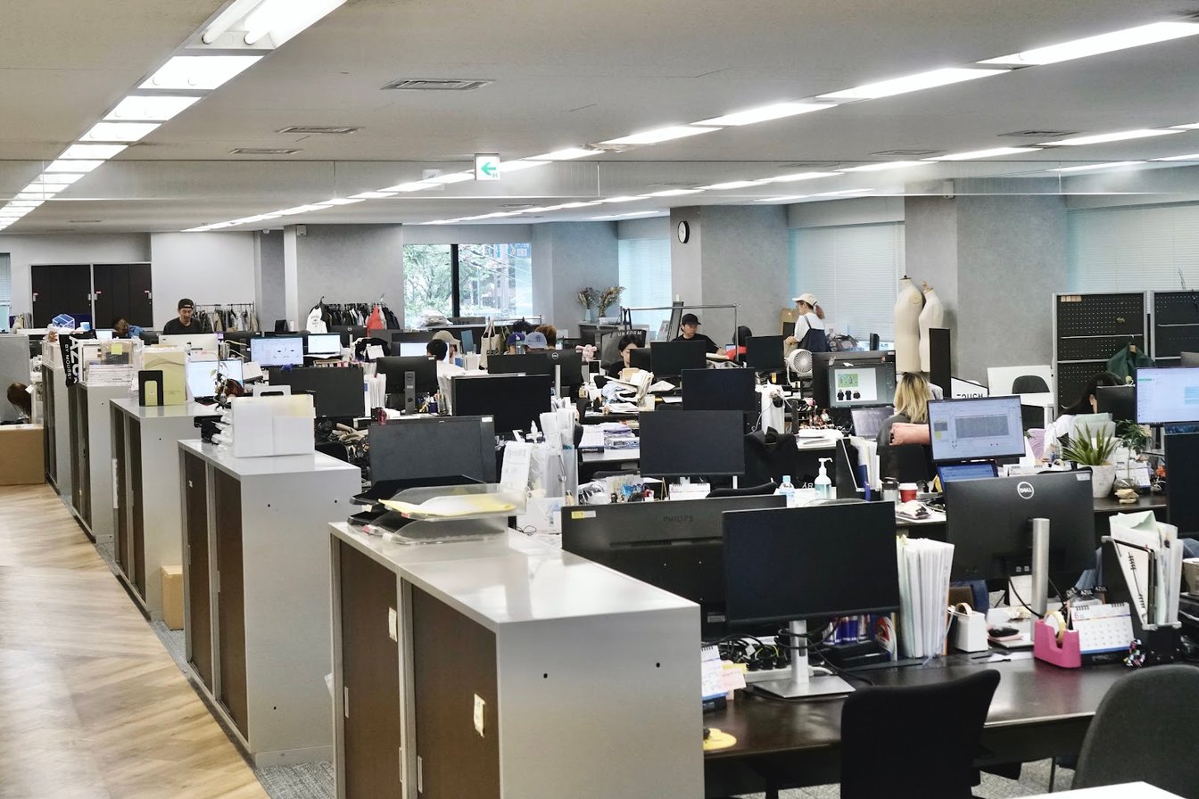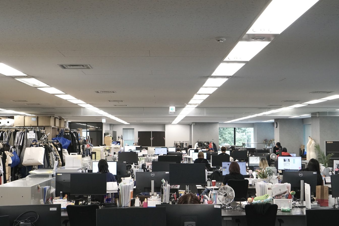 向かって左側のスペースは商品サンプルや生地サンプルがぎっしりと詰まっていて、アパレル企業のオフィスが肌で感じられるような光景です。