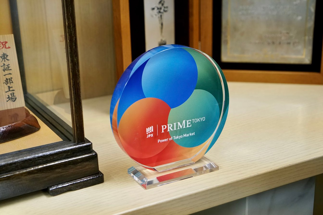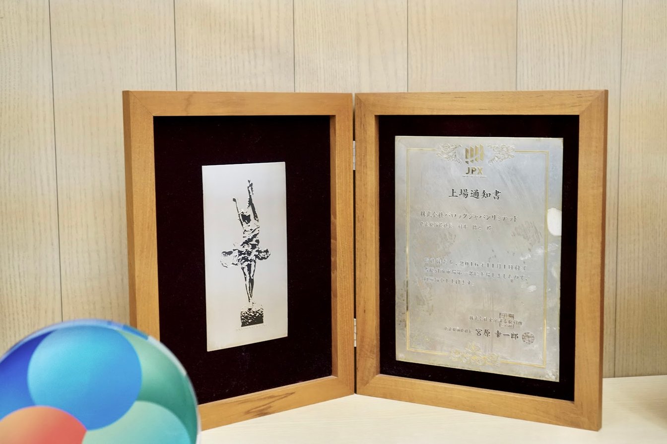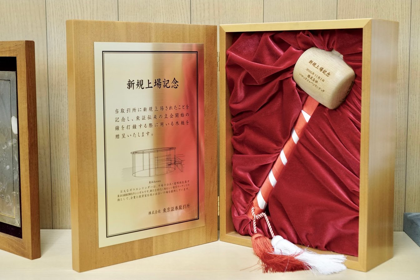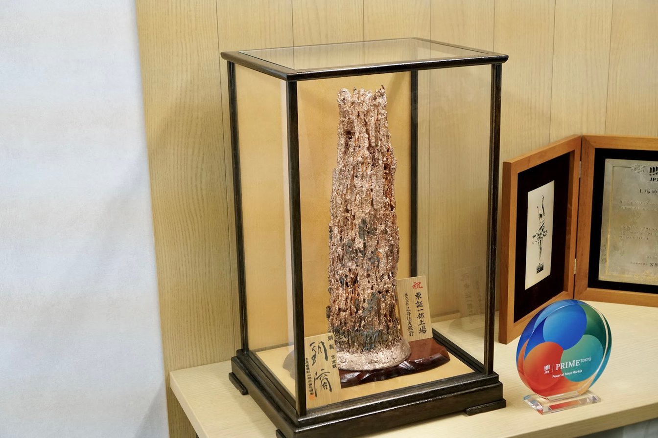 ドアで区切られている空間に特別なカードキーを使って入ると、ずらりと並ぶ東証一部上場時の記念品が。