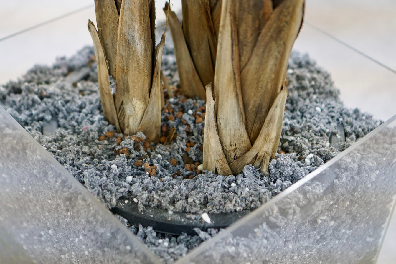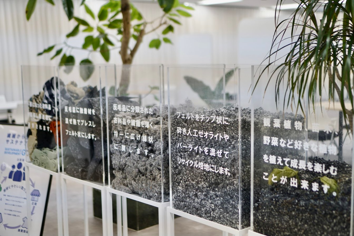 2021年から展開している「SHEL’TTER GREEN」というグリーン事業。廃棄される洋服などから作られたポリエステル繊維リサイクル培地「TUTTI」を使用した観葉植物が飾られています。