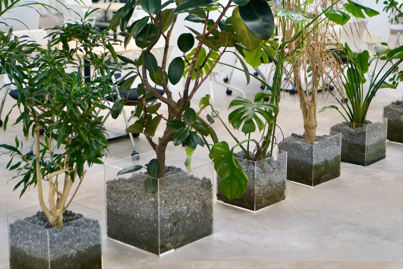 緑が多い印象のミーティングスペース。入り口には、廃棄される洋服から作った、リサイクル培地で育てられている植物がありました。