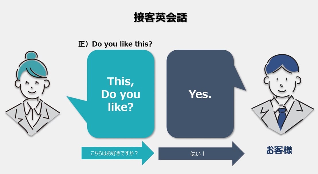 具体的には、文法的に完璧な英語を話すことより、声の大きさや自信を持って話すこと、単語やフレーズでも伝えようとする姿勢の大切さとノウハウを学んでいただけるコンテンツとなっています。教材で使用する例文の内容も販売に特化することで、実際の店頭で役立つスキルとして提供しています。販売職の方々の自信を高め、より良い顧客体験につなげられるようサポートしています。